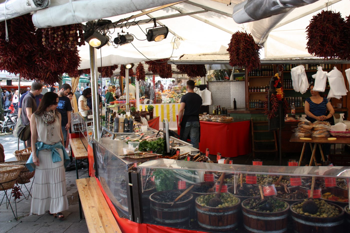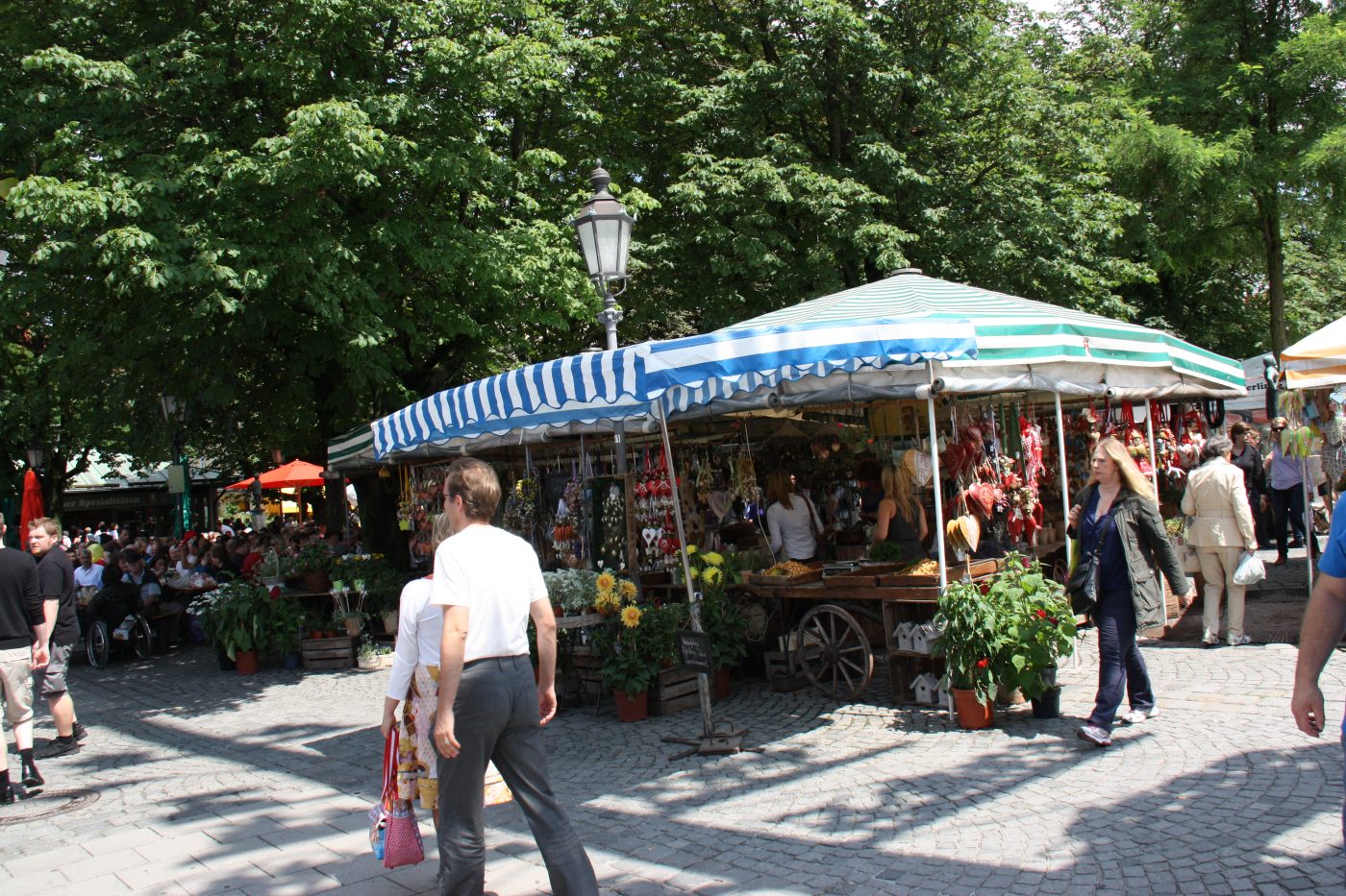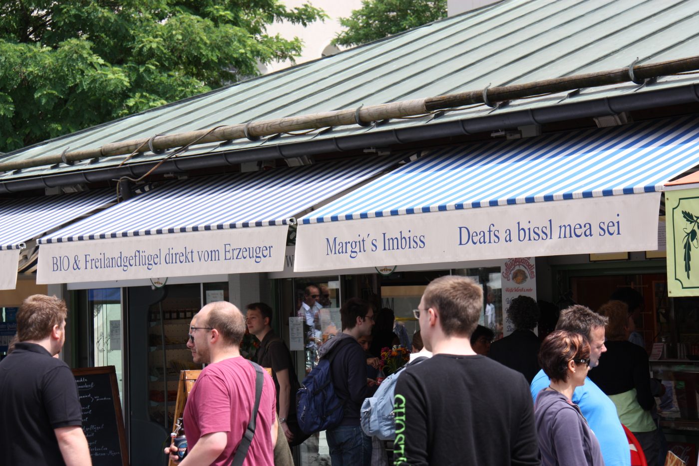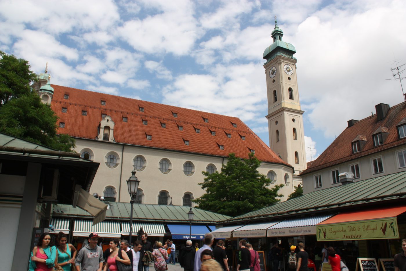 Wer die bayerische und exotische Küche direkt verkosten möchte, der kauft an einem der zahlreichen Imbissstände eine Brotzeit oder ein Mittagessen. Neben Klassikern wie Weißwürste, Haxen und Hendl werden auch viele weitere Gerichte angeboten. Natürlich darf auch Bier aus der Maß nicht fehlen. Und als Ort des Essen befindet sich mitten auf dem Viktualienmarkt einer der zentralsten Biergärten Münchens. Gerade bei schönem Wetter ist hier richtig was los.