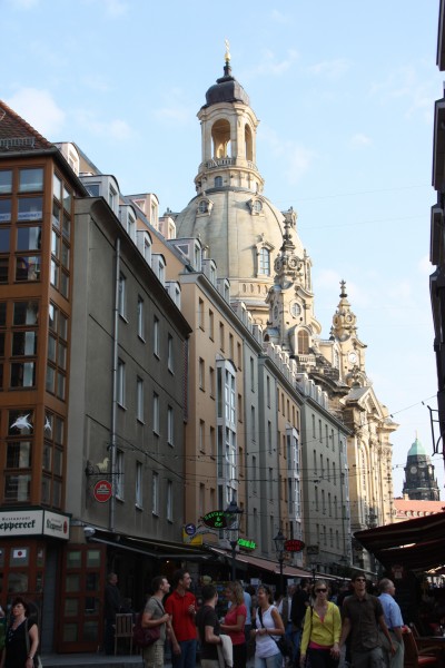 Wer Dresden besichtigt und die Sehenswürdigkeiten besucht kommt an der Frauenkirche nicht vorbei. Die direkt in der Altstadt gelegene Frauenkirche kann somit zu Fuß erreicht werden. Vom Elbufer und den Brühlschen Terrassen oder dem Zwinger geht man zu Fuß nur ein paar Minuten. Und das schöne ist, dass man direkt auf die Frauenkirche zuläuft und diese zunächst aus der Ferne betrachtet dann immer größer wird. Wenn man dann schließlich am Neumarkt ankommt beeindruckt der Bau.