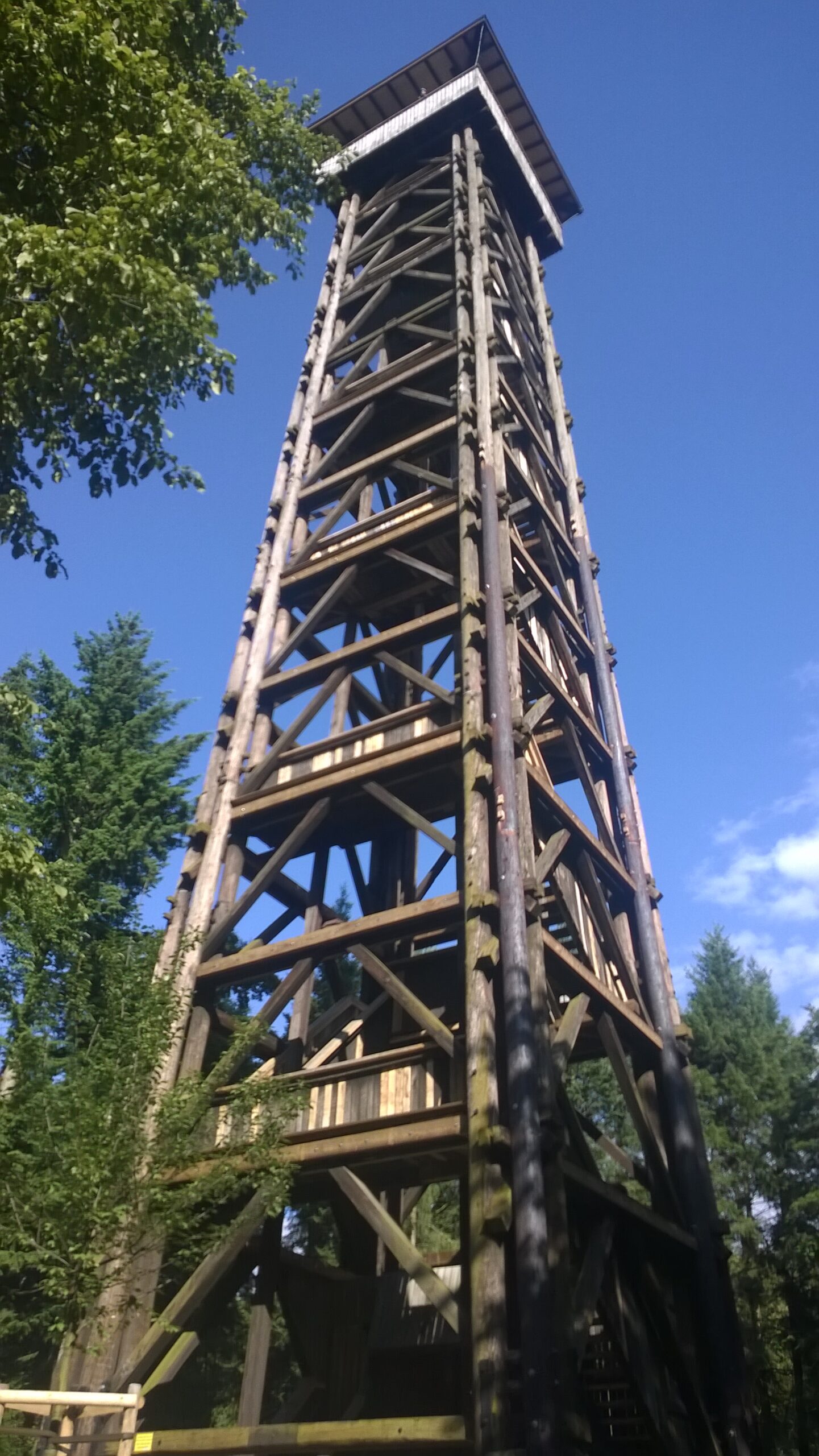 Spätestens nach dem Erreichen der Baumgipfelgrenze wird man für die Mühe entlohnt. Nachdem es zunächst im Inneren des hölzernen Goetheturms nach oben geht und außer Bäumen nicht viel zu sehen ist, hat man bereits kurz vor Erreichen der Aussichtsplattform einen tollen Blick über die Baumgipfel hinweg.