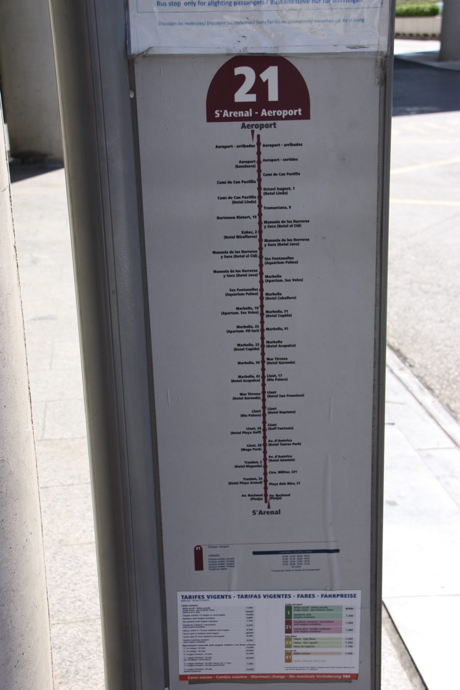 Im Flughafen-Gebäude geht man zunächst in Richtung Gepäckausgabe. Mit dem Koffer in der Hand geht es weiter in Richtung Ausgang. Sobald man den Fluggastbereich verlassen hat folgt man der Beschilderung Bus/Taxi. Sobald man das Flughafengebäude verlassen hat läuft man zunächst an der Warteschlange für Taxi vorbei und am Ende des Taxi-Standes befindet sich auf der gegenüberliegenden Straßenseite die Bushaltestelle. Dort fährt die Linie 21 im 30 Minuten-Takt an der Playa de Palma entlang bis nach El Arenal.