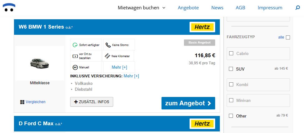 Durch diese clevere Kombination kann es sein, dass für die gleiche Mietstation das gleiche Fahrzeug von verschiedenen Vertragspartnern beim gleichen Autovermieter angeboten werden.