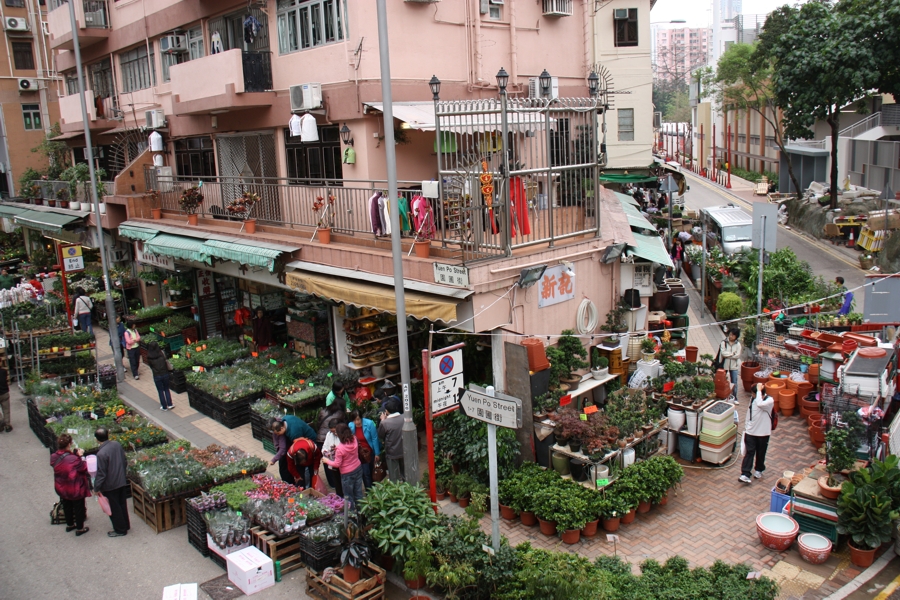 Allerlei Waren auf den Märkten in Hong Kong Buntes Treiben auf Hong Kongs Märkten Einkaufen auf den Märkten Blick auf den Markt von oben Verschiedene Waren auf den Märkten Allerlei Waren auf den Märkten in Hong Kong Ladies Markt in Hong Kong Ladies Market in Hong Kong Flower Market (Mong Kok)