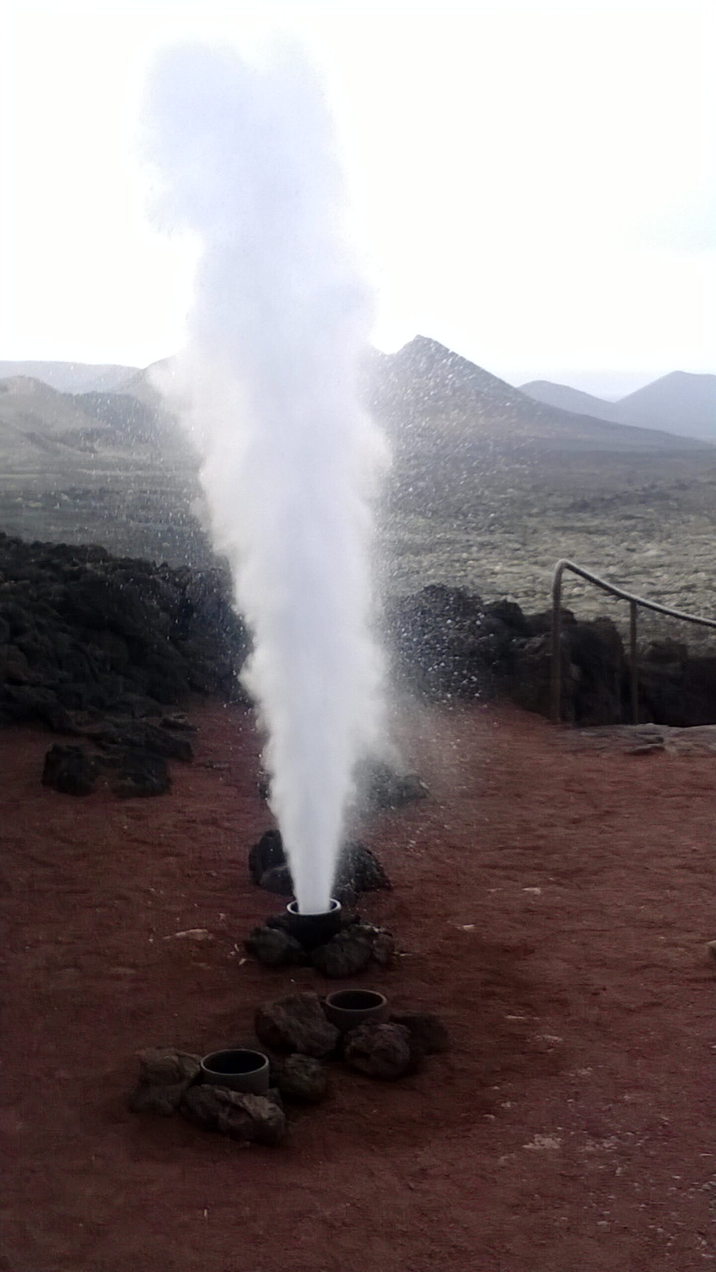 Vulkanberge im Timanfaya Nationalpark Lavagestein auf Lanzarote Feuerberge "Montana del Fuego" Nationalpark Timanfaya Vulkankrater auf Lanzarote Sehenswürdigkeit Nationalpark Timanfaya Starke Hitze in den Feuerbergen Wasserfontäne im Nationalpark Timanfaya Restaurant "El Diablo" (Der Teufel) Landschaft im Timanfaya Nationalpark Wegweiser Timanfaya Straße durch Lavageröll zu den Feuerbergen